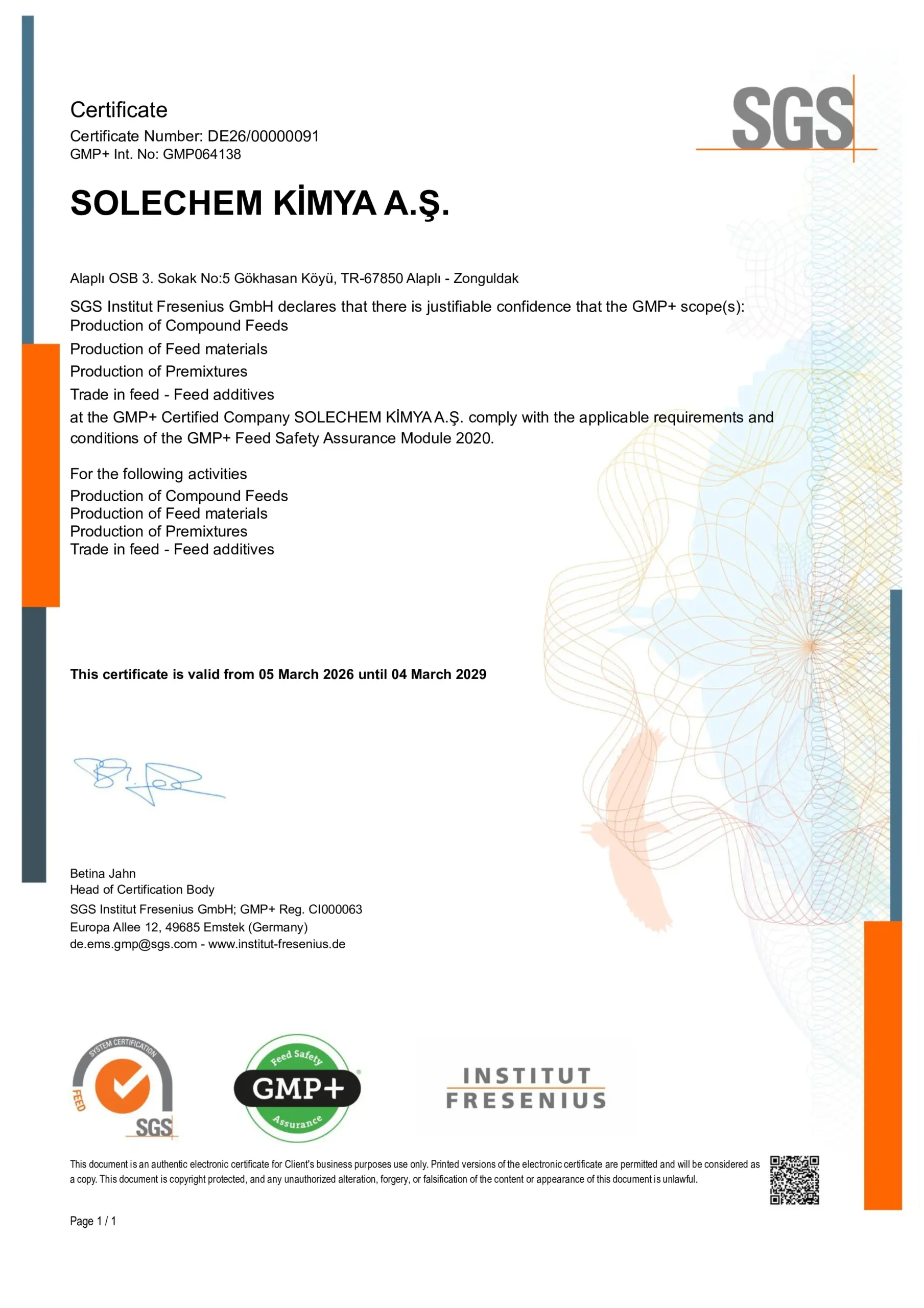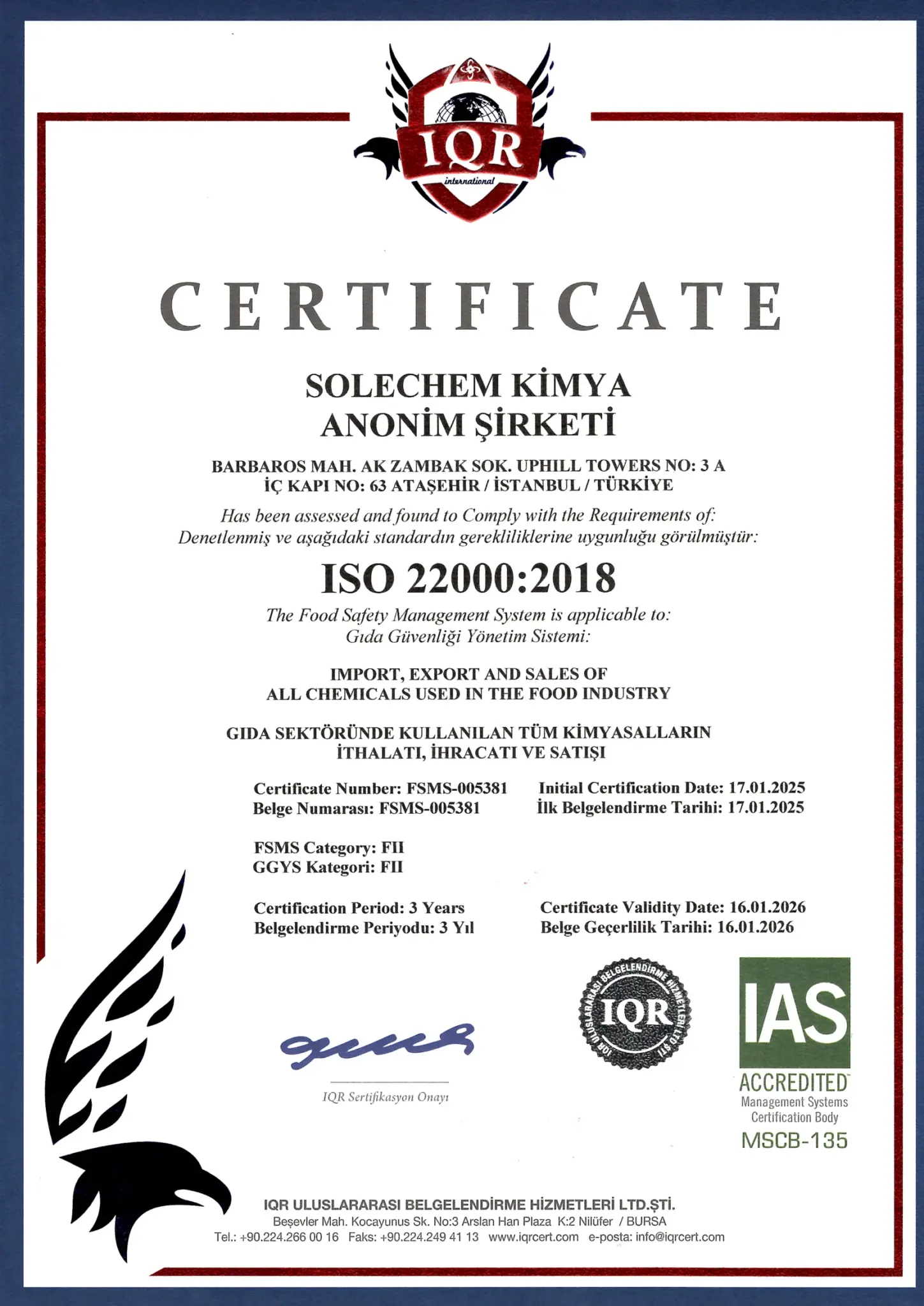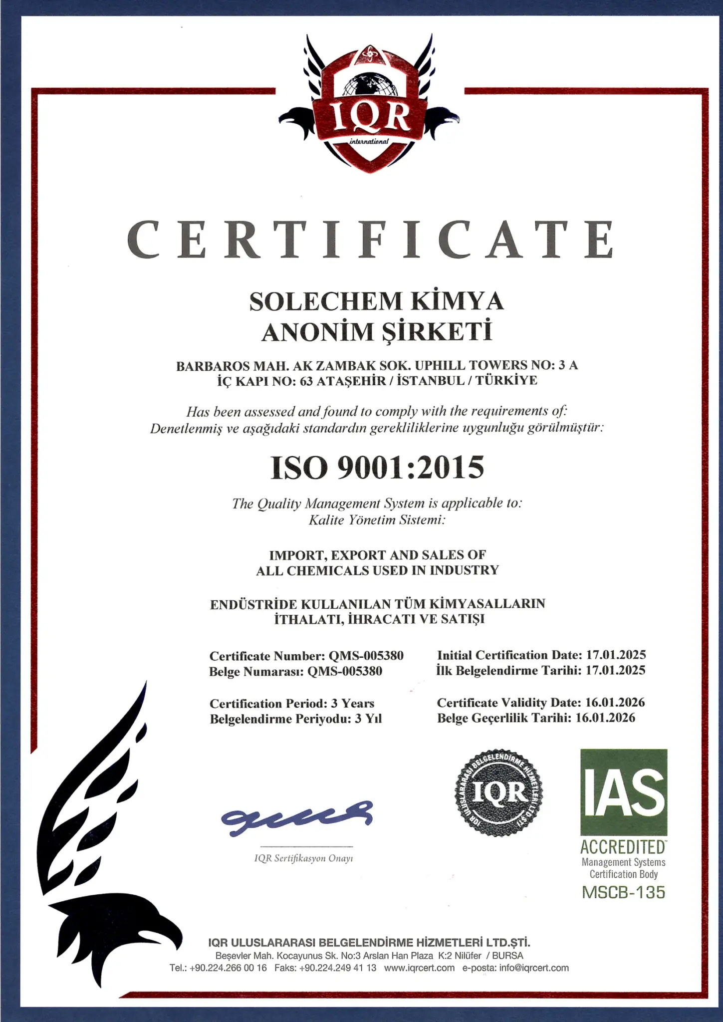 Endüstride kullanılan tüm kimyasalların ithalat, ihracat ve satışı için sertifikalı kalite yönetim sistemi. IQR ve IAS akreditasyonlu.